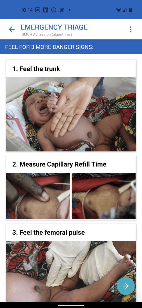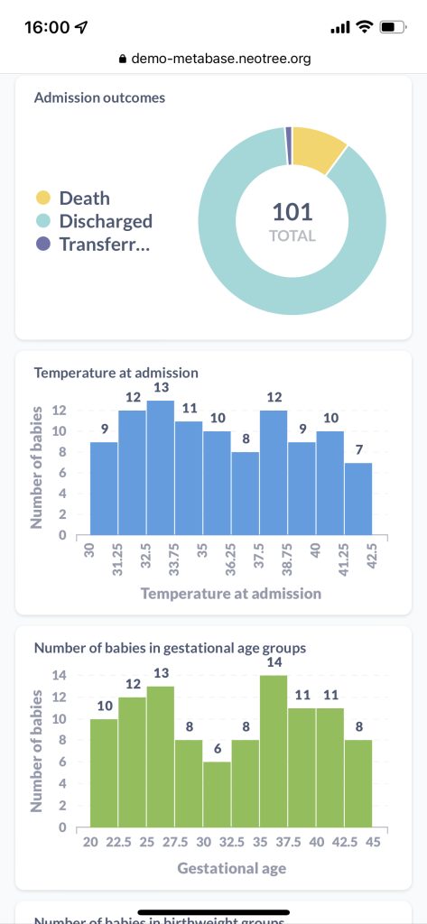 The Neotree mobile app guides healthcare workers to perform all relevant checks when babies are admitted into and discharged from the neonatal ward, and provides clinical management support as they provide care at the babies' bedside. This clinical management support is adaptable to local context and resources.