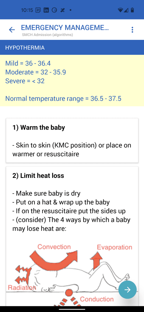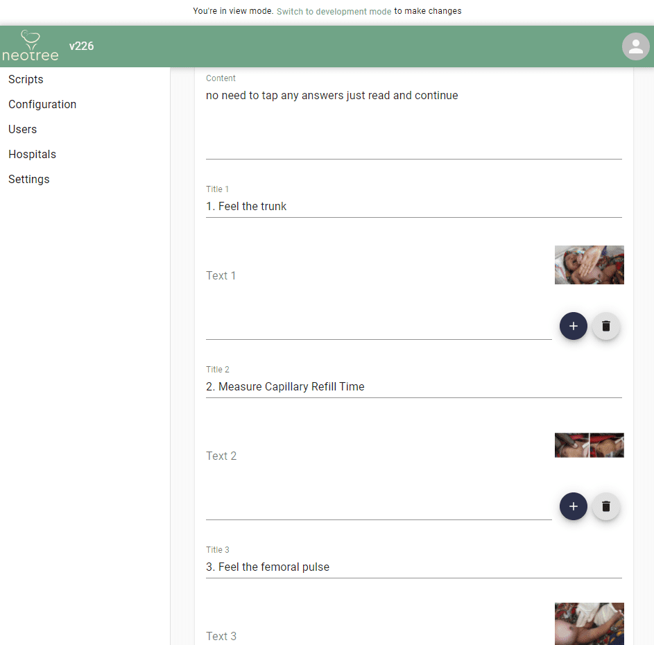 The Neotree mobile app guides healthcare workers to perform all relevant checks when babies are admitted into and discharged from the neonatal ward, and provides clinical management support as they provide care at the babies' bedside. This clinical management support is adaptable to local context and resources.